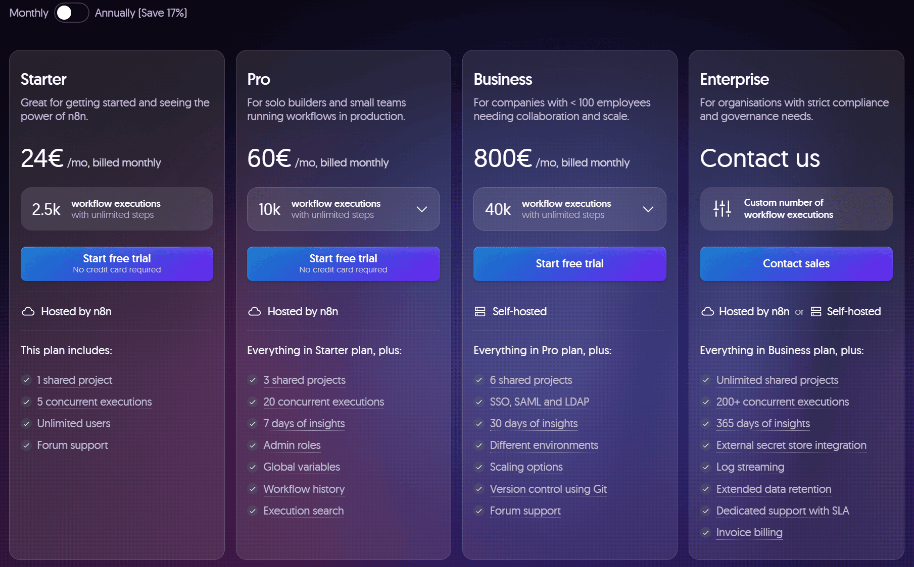 La version cloud de n8n. Tu t’inscris, tu paies un abonnement mensuel et c’est tout. Aucune installation, aucune maintenance. Parfait si tu veux commencer tout de suite, mais il y a des limitations sur le plan gratuit et tes données sont sur des serveurs tiers. problème ? peut-être le prix ? prix n8n 2025