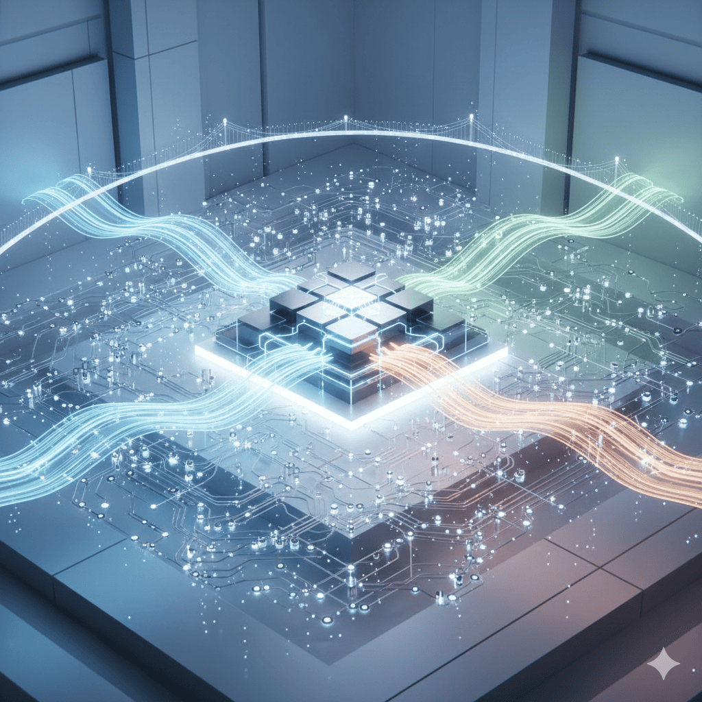 Illustration numérique conceptuelle symbolisant une technologie de stockage open source mature. Trois flux de données distincts (de couleurs subtilement différentes) convergent vers une seule structure lumineuse, symbolisant l'intégration et l'évolutivité. L'environnement évoque un centre de données moderne avec un éclairage doux bleu et blanc, une géométrie épurée et un sentiment de précision et de fiabilité.
