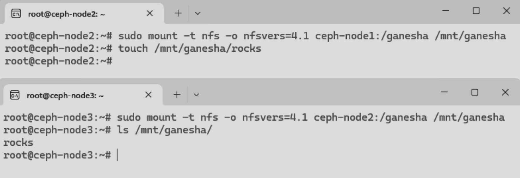 Disons que nous avons un cluster avec 3 nœuds prêts pour ganesha, cela signifie que nous pouvons exporter avec succès les fs ceph sous-jacents du nœud 1 au nœud 2 et du nœud 2 au nœud 3, ou de la manière que nous voulons !