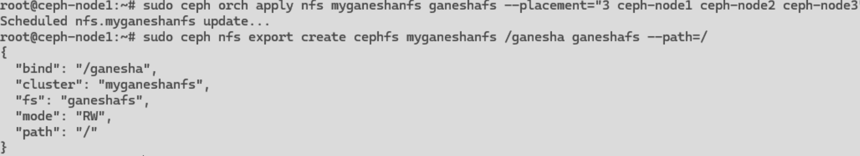 # sudo ceph orch apply nfs myganeshanfs ganeshafs --placement="3 ceph-node1 ceph-node2 ceph-node3"