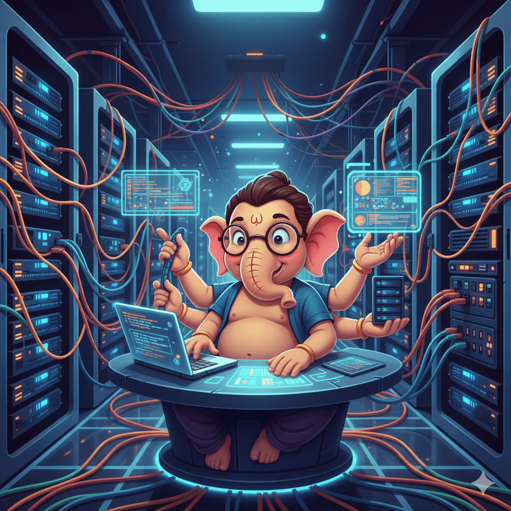 Un centre de données moderne rempli de nœuds de stockage Ceph incandescents connectés dans un cluster résilient. Au centre, une sympathique divinité Ganesha de style dessin animé est assise à une console à plusieurs bras gérant les exportations NFS, les câbles et les serveurs. Une main tient un câble réseau, une autre un ordinateur portable, une autre un logo Ceph lumineux, symbolisant la haute disponibilité et l'orchestration.